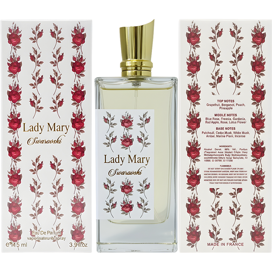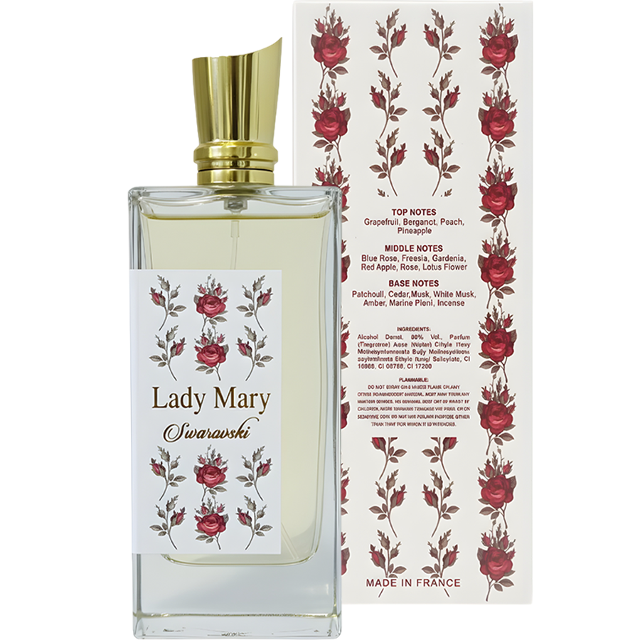 لیدی ماری (Lady Mary by Swarovski) یک ادو پرفیوم زنانه است که ظرافت کلاسیک را با جذابیتی مدرن و قوی در هم می‌آمیزد. این عطر با ترکیبی گلی، میوه‌ای و شیرین، برای خانم‌های شیک‌پوش، کاریزماتیک و مستقل طراحی شده است. با وجود رایحهٔ ملایم و شیرین اولیه، عمق چوبی و دودی نت‌های پایانی، ماندگاری بالا و پخش بوی قوی آن را تضمین می‌کند و رایحه‌ای جذاب و دلنشین به جا می‌گذارد.