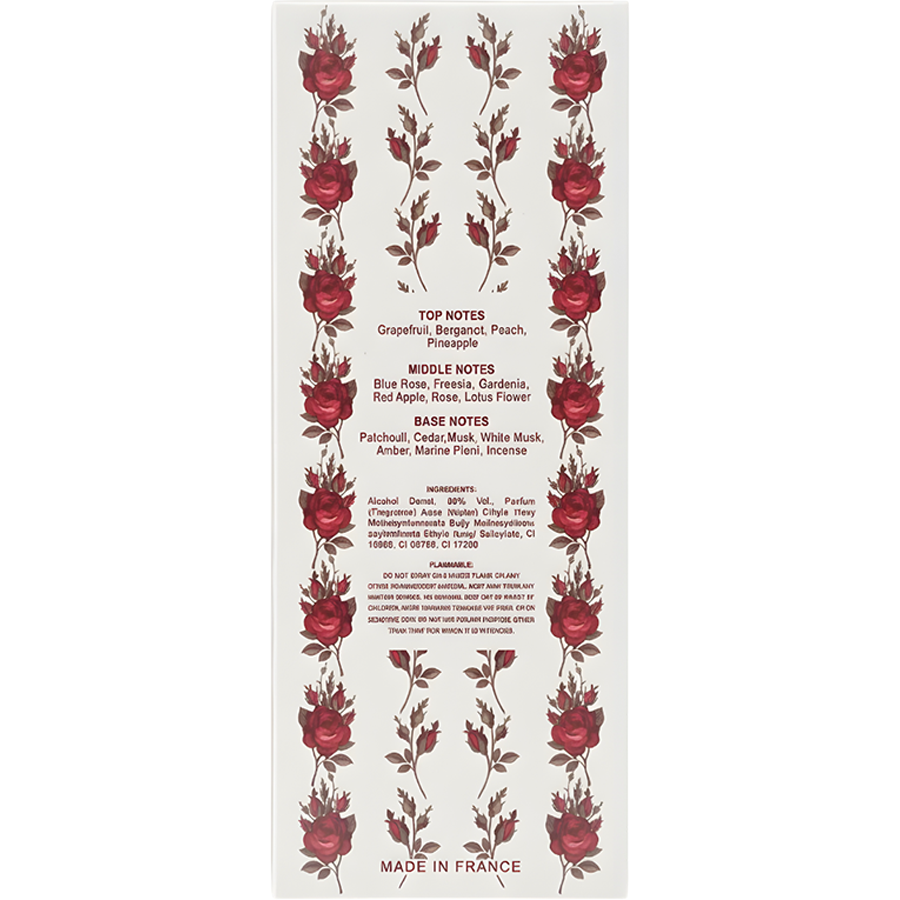 *  نت‌های میانی (Middle Notes): قلب عطر مملو از هارمونی گلی است، شامل رز آبی (Blue Rose)، فریزیا (Freesia)، گاردنیا (Gardenia)، سیب قرمز (Red Apple)، گل رز (Rose) و گل نیلوفر آبی (Lotus Flower). این بخش، لطافت و اصالت زنانهٔ عطر را به نمایش می‌گذارد.