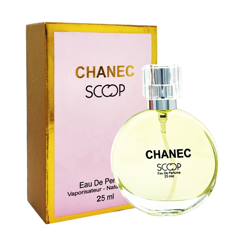 در بخش طراحی ظاهری، اسکوپ چنس کاملاً از زبان طراحی نسخه اصلی الهام گرفته است. بطری نسخه 100 میلیلیتری به شکل دایرهای، تخت و شفاف طراحی شده که مایع زرد و روشن درون آن به خوبی نمایان است. نام "CHANEC" و لوگوی برند "SCOOP" با فونتی خوانا روی شیشه نقش بسته است. درب بطری به شکل یک مکعب مشکی است که هارمونی خوبی با طراحی کلی دارد. جعبه عطر نیز با رنگ صورتی ملایم و حاشیههای طلاییرنگ براق، کاملاً یادآور بستهبندی شیک و کلاسیک شنل چنس است. نکته بسیار مثبت و کاربردی در مورد این محصول، عرضه آن در دو حجم متفاوت است. علاوه بر شیشه 100 میلیلیتری که برای استفاده روی میز آرایش مناسب است، یک نسخه مینیاتوری 25 میلیلیتری (عطر جیبی) نیز با همان فرمولاسیون و طراحی مشابه (با دربی شفاف) تولید شده است که برای حمل در کیف دستی و تمدید عطر در طول روز و مسافرتها بسیار ایدهآل است.